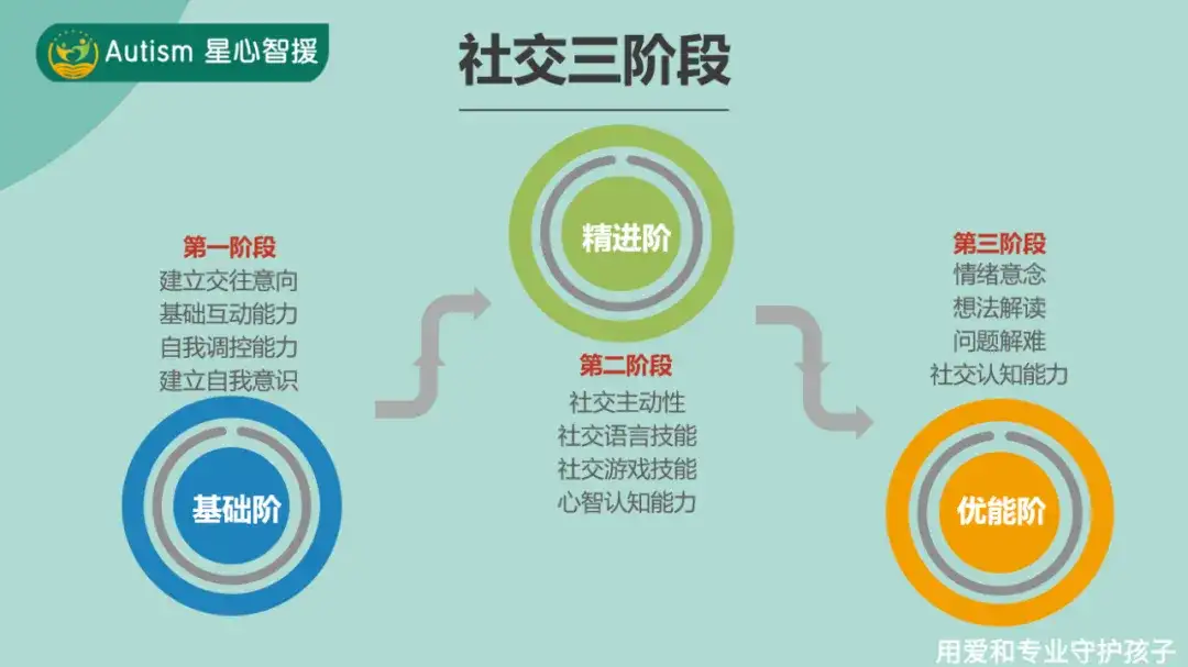 社交沟通干预,围绕社交沟通的三大先决条件:社交意向,社交技巧和社交思考,结合孩子的发展阶段与干预需求,制定干预目标。